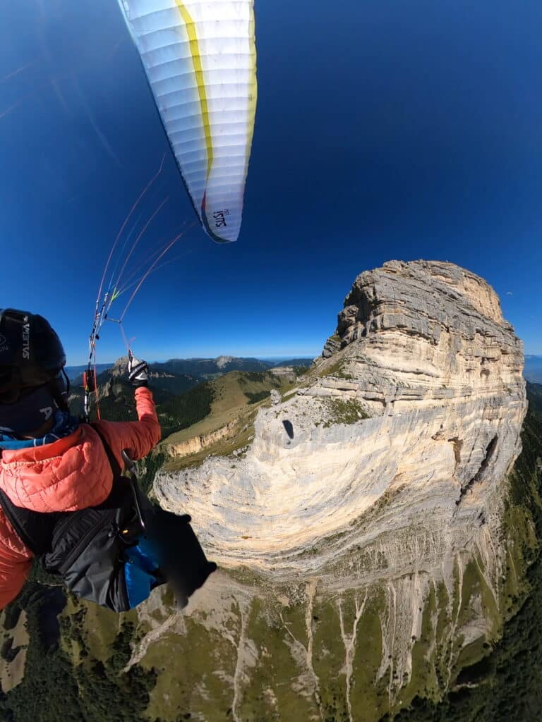 Pour mon premier hike and fly à la Dent de Crolles, je teste la Susi Xped d’AirDesign. Et quelle chance car elle gonfle très facilement et prend en charge efficacement. Dès la sortie du décollage la masse d’air thermique me permet de grappiller un peu de hauteur. Même sous cette 16 j’arrive à enrouler, c’est magique. Alors évidemment j’en profite pour glisser jusque sous le pilier Sud de la Dent. Je me sens tellement bien que je me rapproche des falaises. Et au moment où j’arrive à l’éperon sud, une bouffée d’émotion m’envahit. Vous savez, cette émotion qui part du ventre, qui monte gentiment et explose dans le cerveau. Enfin c’est fait, enfin ma première rando-vol à la Dent. J’en ai des larmes de bonheur aux yeux. Mais elles ne troubleront pas ma vue. Et je profite un maximum du plané incroyable de cette SuSi pour longer ces falaises du haut que je découvre enfin. Je finis par me laisser descendre vers les antennes pour rejoindre la cascade. Presque personne en vol, alors qu’il est déjà midi. En fait ça ne tient pas, la masse d’air est ultra stable à cette altitude. Qu’est-ce qu’on a bien fait de monter à la Dent aujourd’hui. A l’atterrissage je tente de poser dans la cible. Mais c’est un matelas de presque un mètre d’épaisseur. Et je m’y suis mal prise. Donc je m’éclate lamentablement contre le flanc du matelas. Je vous laisse imaginer la scène. Passer ce moment de honte, c’est l’euphorie qui m’envahit à nouveau. Ah les montagnes russes émotionnelles du parapente ! Même avec de nombreuses expériences de vol sur de nombreux sites, les sensations